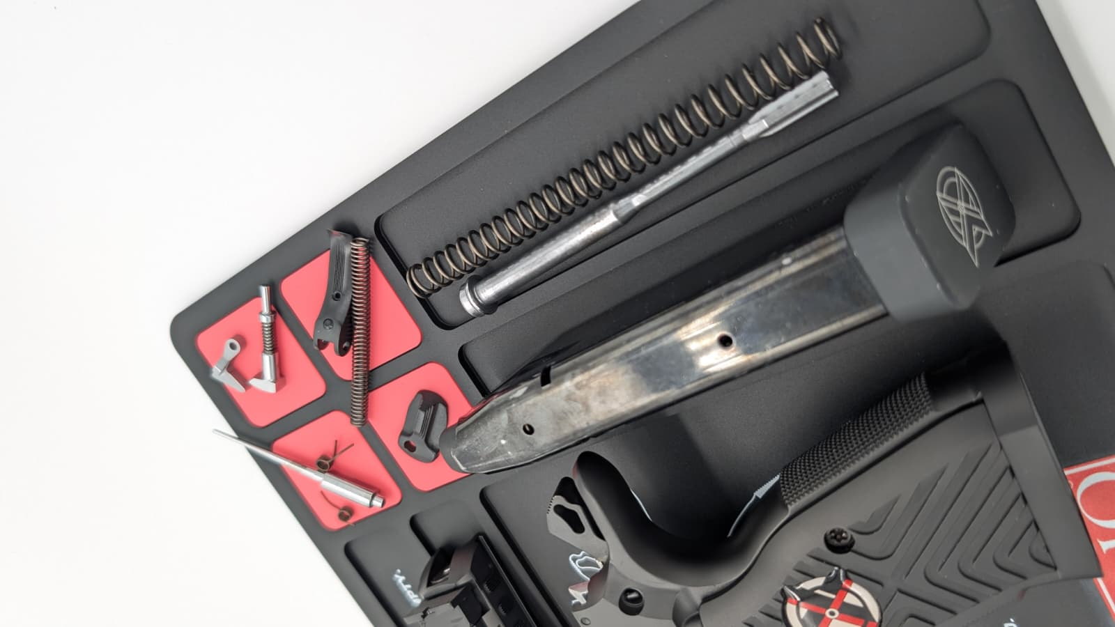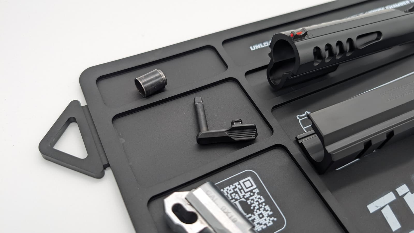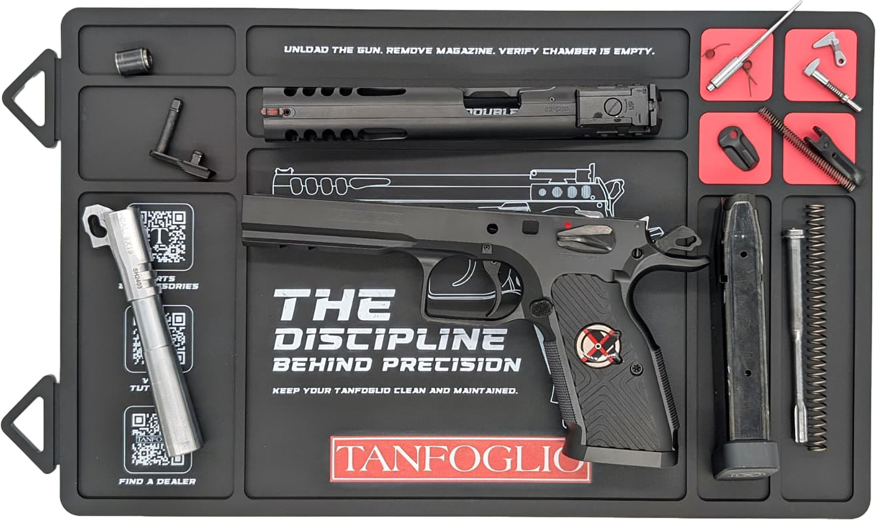Tanfoglio pusse- og vedlikeholdsmatte er en praktisk og slitesterk arbeidsmatte for våpen og deler. Matten er laget i gummi og gir en stabil arbeidsflate som beskytter både våpen og underlag under puss og vedlikehold. Opphøyde kanter og integrerte rom gjør det enkelt å holde orden på deler og småkomponenter.